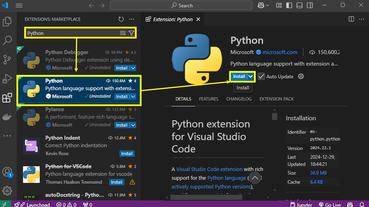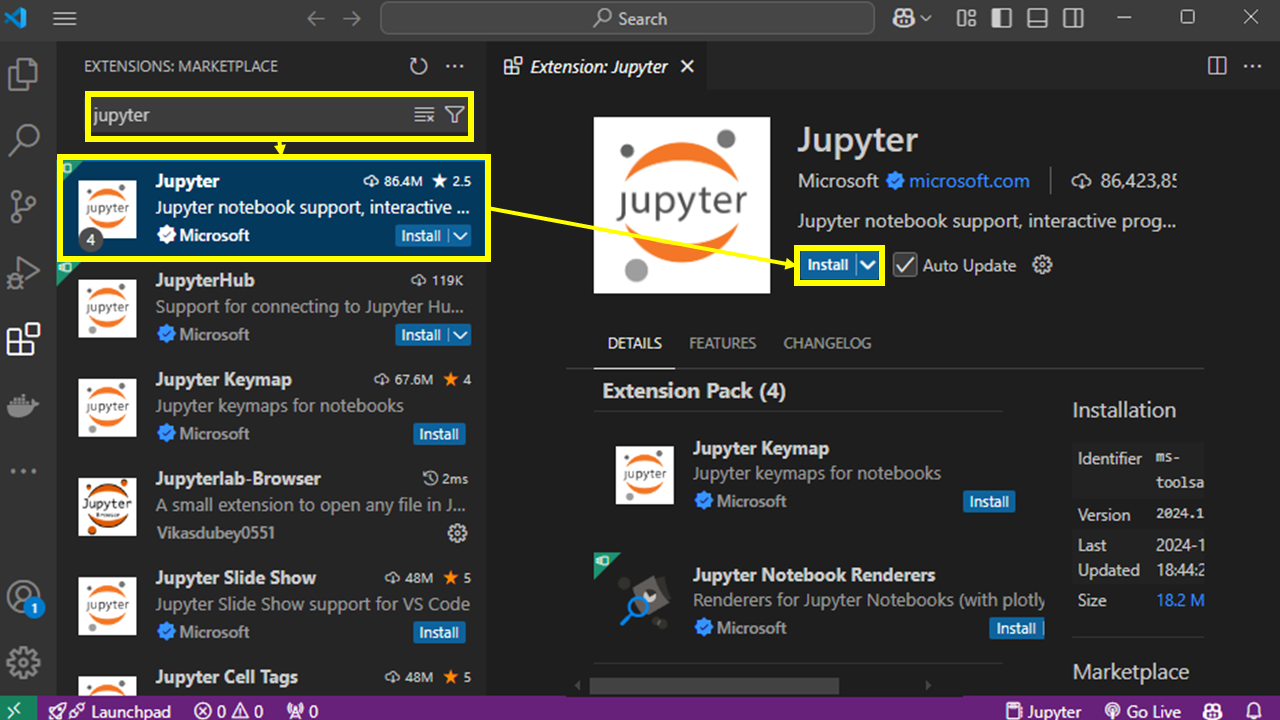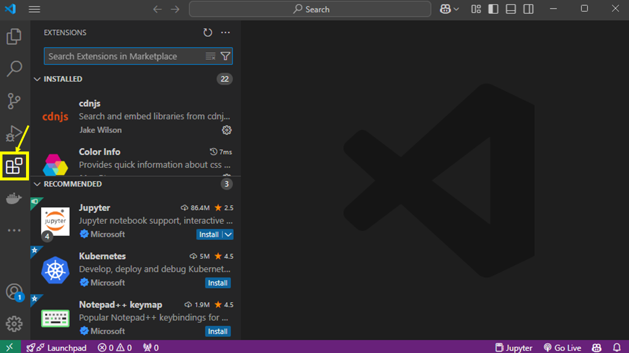 下载Visual Studio Code 安装已下载的 Visual Studio Code (把它拷贝到应用程序文件夹) 在扩展程序的左侧菜单中点击 Jupyter 的“安装”按钮